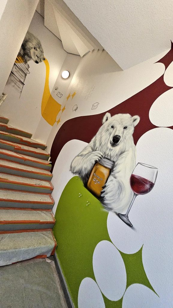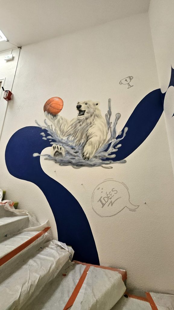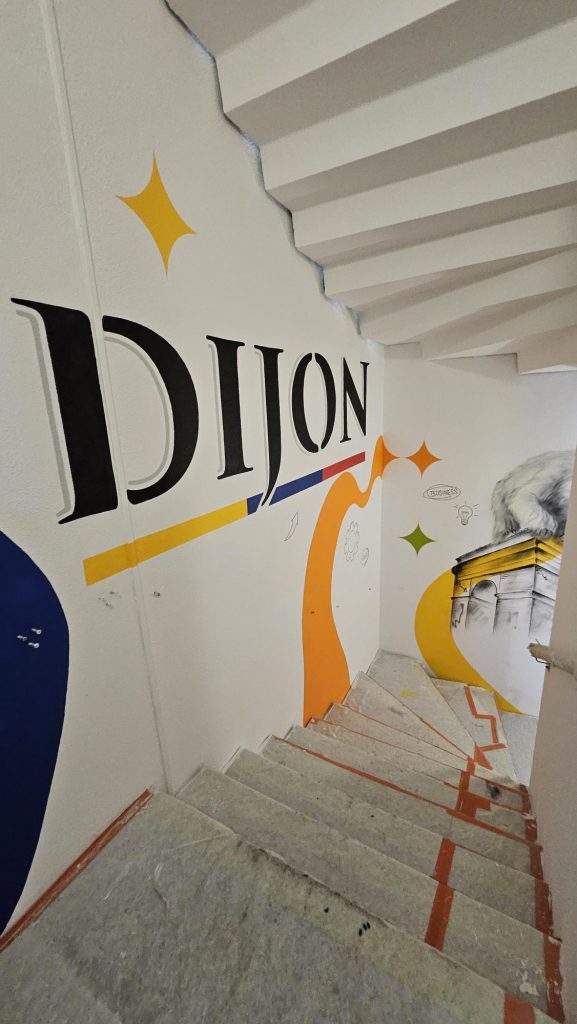 L’école supérieure ESG Dijon nous a sollicité pour la décoration de la cage d’escaliers de leur nouveau campus « Millésime ». L’idée était d’intégrer leur nouvelle charte graphique en y ajoutant des éléments en rapport avec le patrimoine local combiné à ce qui se fait au sein du campus.