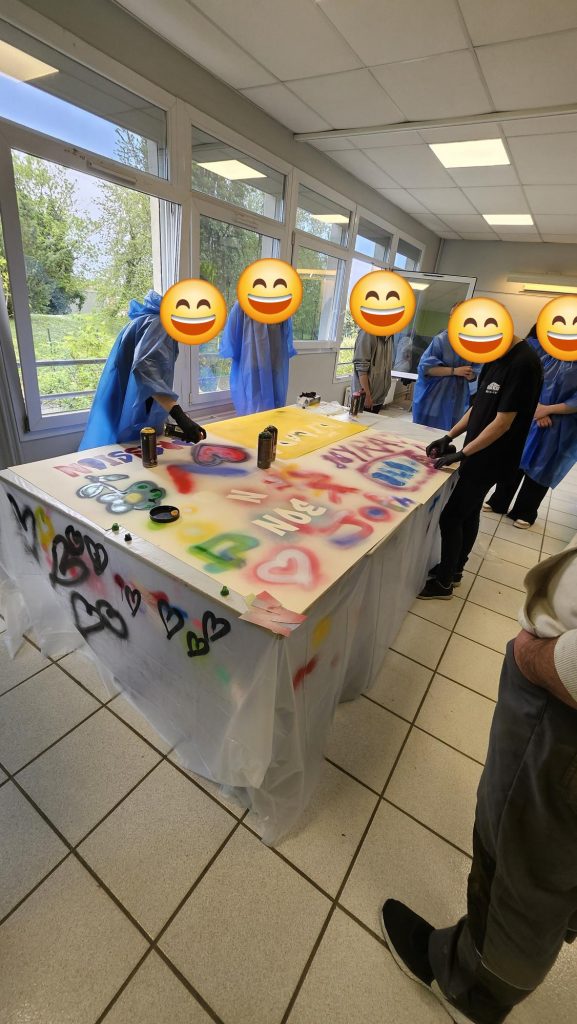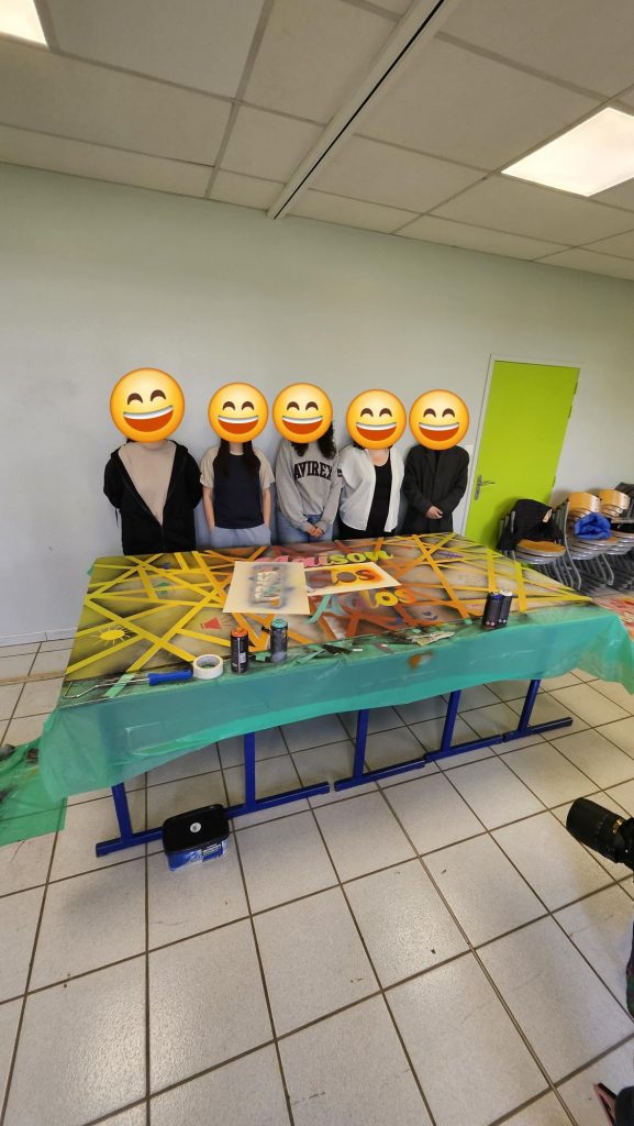 -2ème jour initiation au pochoir, manipulation de la bombe de peinture, réalisation d’un panneau décoratif pour les locaux de la maison ados.