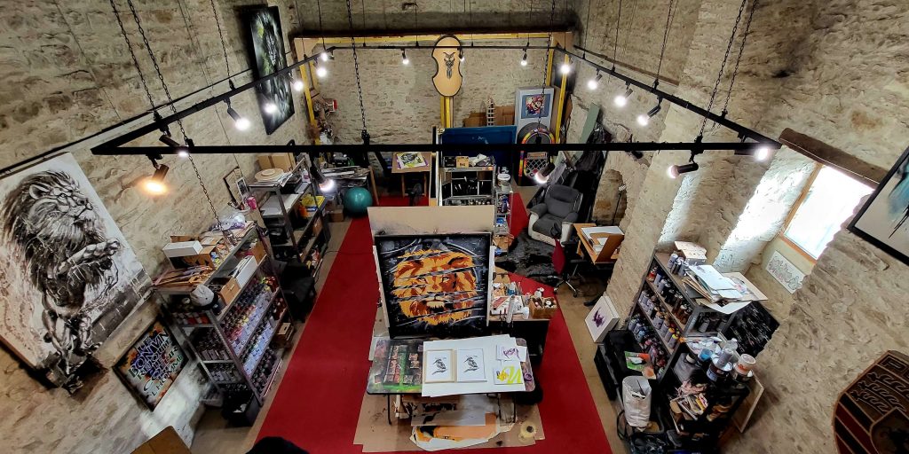 L’atelier est le lieu de résidence de plusieurs de nos artistes qui y travaillent et une grande partie des œuvres du collectif y sont présentes.